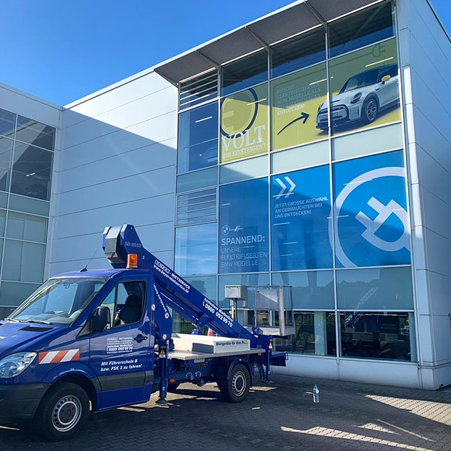 Auch Sonderlösungen wie schaltbare Folien, architektonische Folien oder großflächige Werbebeklebungen setzen wir zuverlässig um – von der Beratung über die Planung bis zur fertigen Montage.